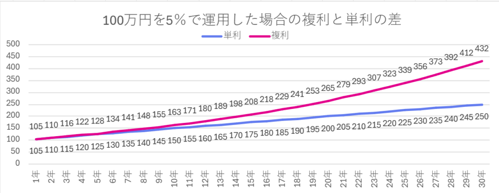 → 例:10万円を年5%で運用すると、毎年5,000円の利息
